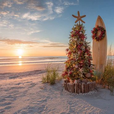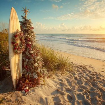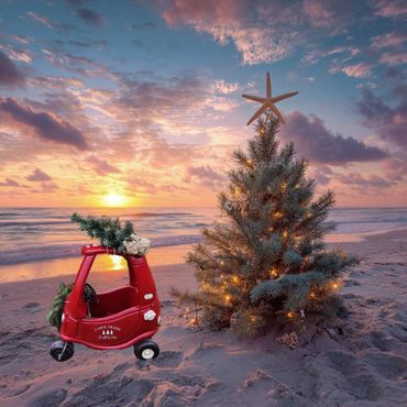 Includes Full Size Christmas tree in the sand with bulbs and starfish topper, adult size surfboard decorated for Christmas, kids surfboard decorated and ride on tree farm car for the little ones to. Also includes any non themed photos as well. Same prices as above (certain beach locations available for mini pricing).
